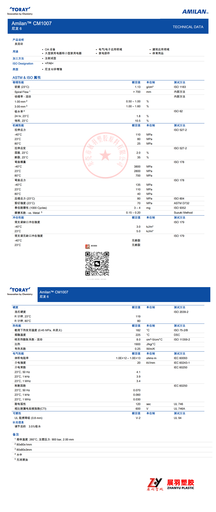 AMILAN? CM1007 由東麗公司生產(chǎn),是一種未填充的聚酰胺6 (PA 6) 等級。具有高流動性、優(yōu)異的強度、韌性、耐熱性和抗摩擦磨損性能。