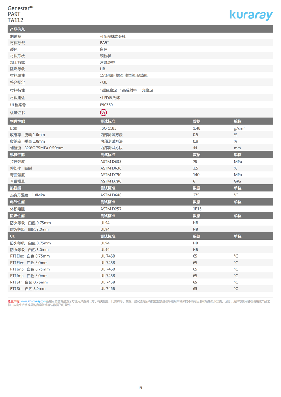 可樂麗 Genestar? PA9T TA112 >PA9T-GF15< 阻燃等級(jí): HB 符合規(guī)定: UL