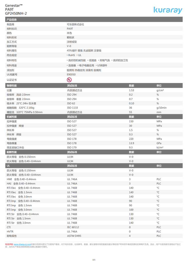 可樂(lè)麗 Genestar™ PA9T GP2450NH-2 >PA9T-GF45-FR< 阻燃等級(jí): V-0 缺口沖擊: 9.3 kJ/m2 符合規(guī)定: RoHS ? UL
