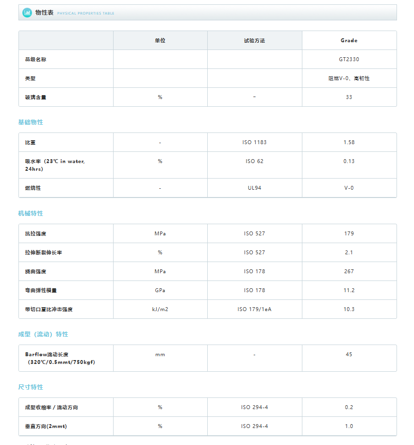可樂麗 Genestar™ PA9T GT2330 >PA9T-GF33-FR< 阻燃等級: V-0 缺口沖擊: 10.3 kJ/m2 符合規(guī)定: UL 材料特性: 高強度 ? 高韌性